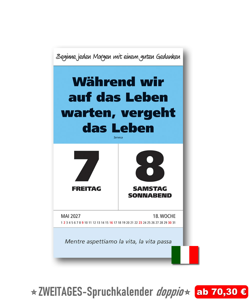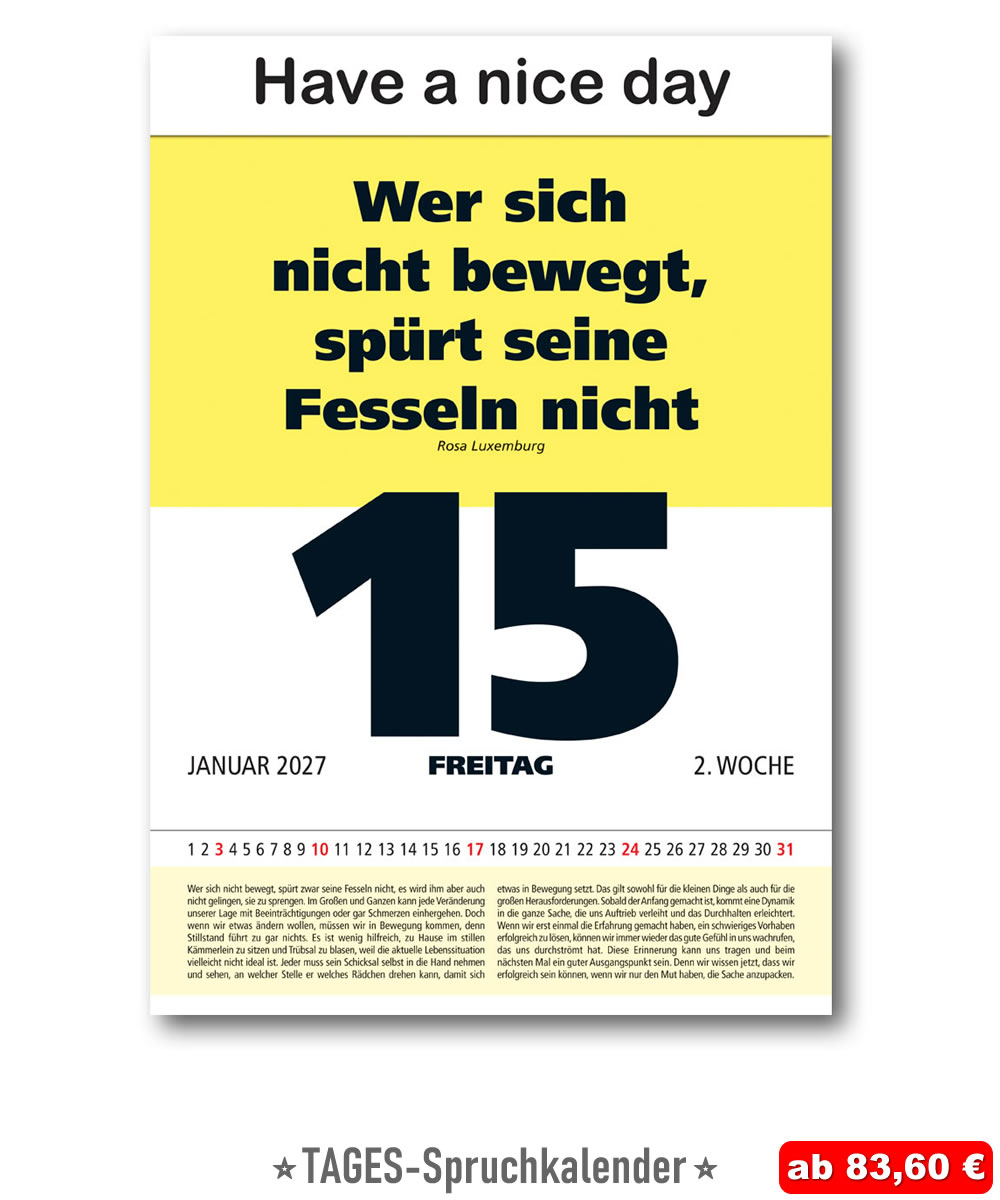 Egal, ob im Büro oder bei Ihnen zuhause an der Küchenwand: Dieser Abreißkalender ist Ihre tägliche Meditations- und Inspirationsquelle und ein ganz besonderer Impulsgeber durch seine Übersichtlichkeit, seine dezenten Farben und natürlich durch das XXL-Format (ausgenommen Zweitagesspruch-Kalender). Wir wünschen Ihnen nun viel Freude bei der Auswahl! Unser Tipp: Zu jedem Spruch-Kalender können Sie zusätzlich eine aus über 21 kostenlosen Standard-Kopfleisten wählen und am Kalenderkopf anbringen. Sie kreieren dadurch einen ganz individuellen IMPULS-Kalender mit Ihrem persönlichen Jahresmotto! Haben Sie Fragen? Rufen Sie uns an: Tel. +43225280534 E-Mail: Info@Impuls-Kalender.at