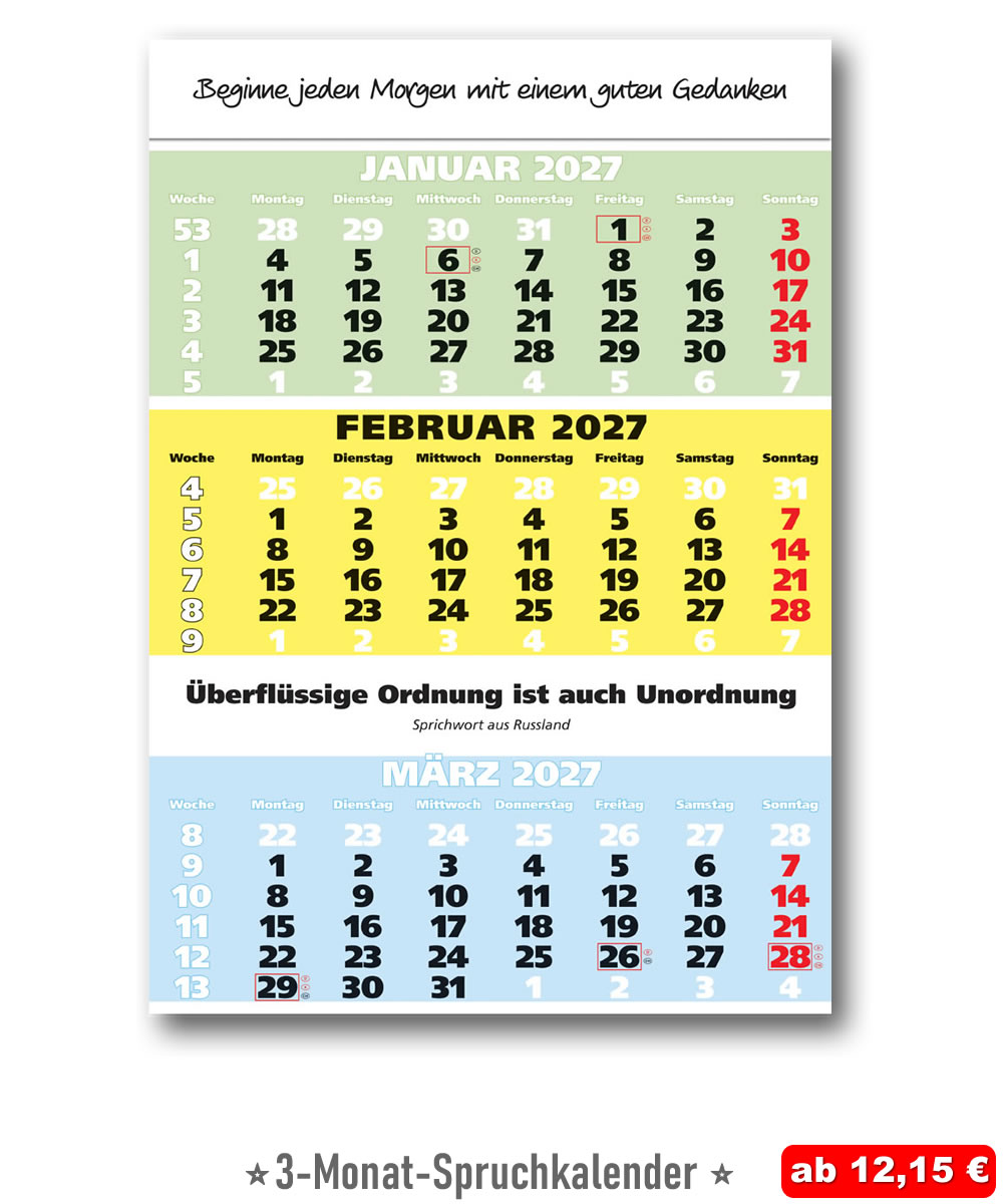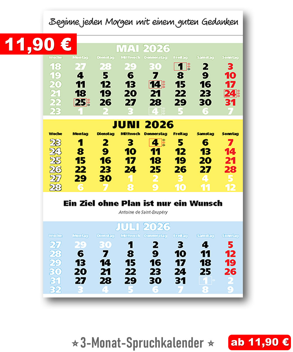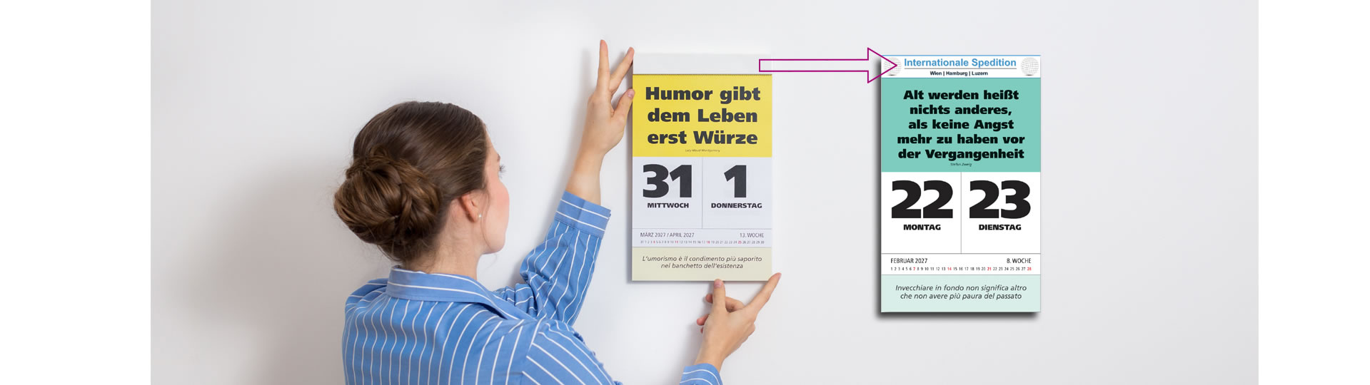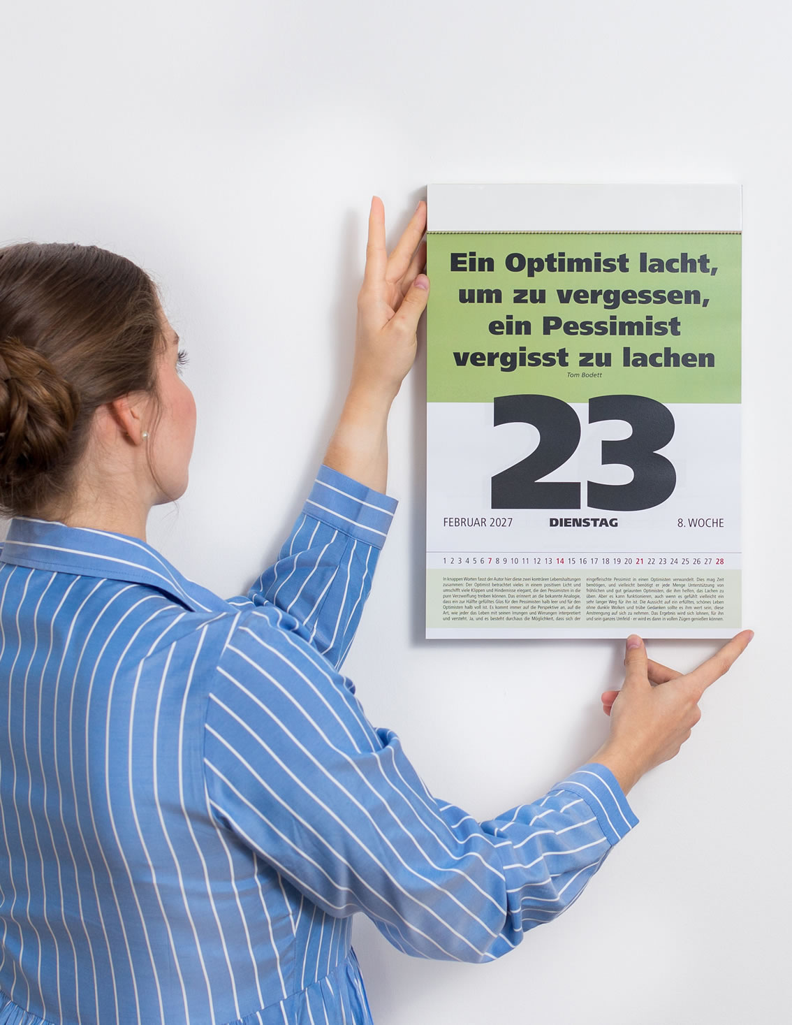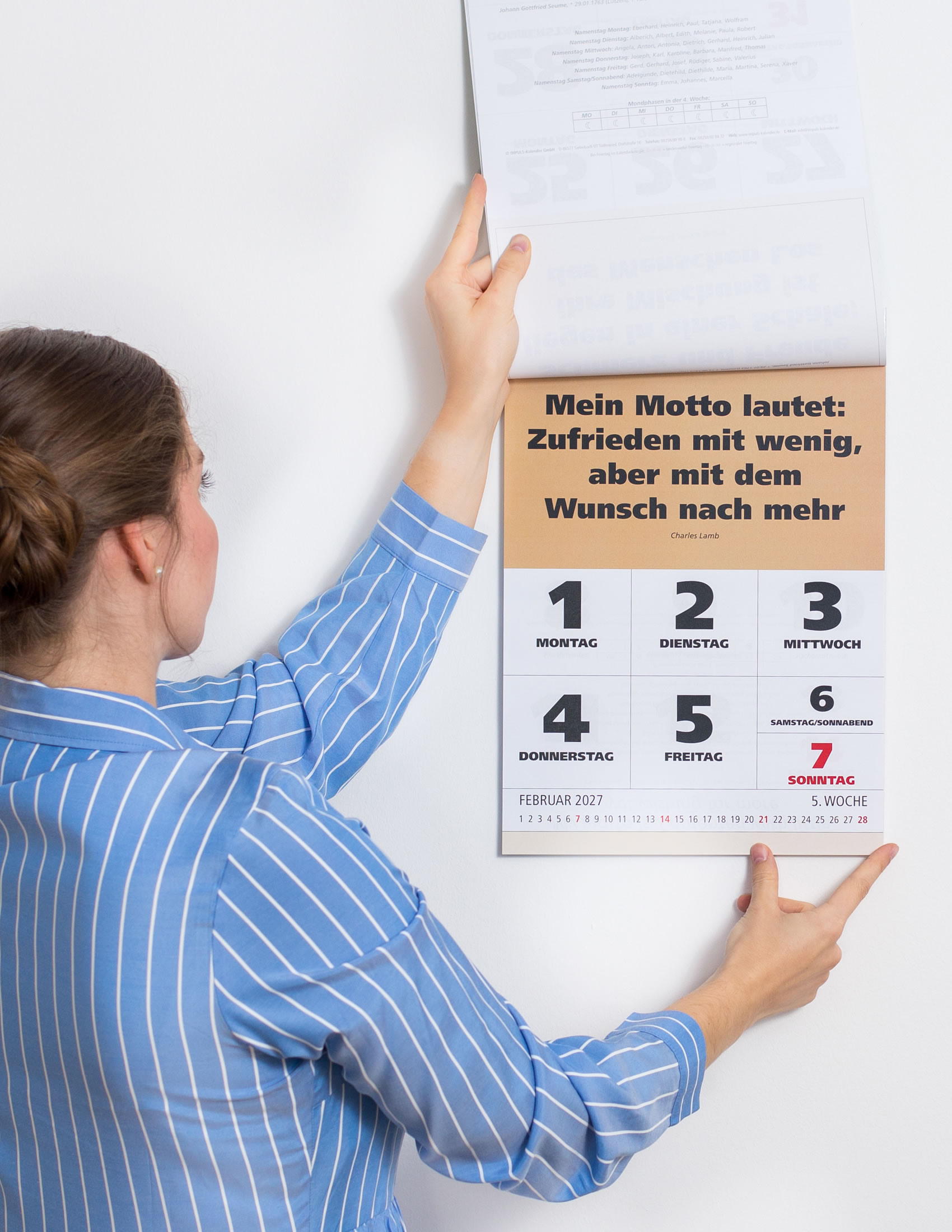 Als schönes Extra erhalten Sie auf der Blattrückseite des Sprüche-Kalenders zusätzlich die englische Übersetzung des Zitats, alle Angaben zum Spruchautor sowie die Nennung der Namenstage und Mondphasen. Ein von Ihnen individuell gewähltes, kostenloses Jahresmotto in Form einer Standard-Kopfleiste am Kopf des Wandkalenders gibt zusätzliche Motivation zum neuen Tag. Gerne wird dieser beliebte Zitate-Kalender auch verschenkt: Von Mensch zu Mensch, aber auch von Firmen wird er als eindrucksvolles Werbegeschenk geschätzt. Die Möglichkeiten zur Individualisierung sind vielfältig und kostenlos! Seien Sie versichert, dass Sie auf jeden Fall ein außergewöhnliches und äußerst gerne gesehenes Geschenk überbringen, wodurch Sie beim Beschenkten ein ganzes Jahr lang in bester Erinnerung bleiben. Der IMPULS-Kalender wird gerne an zentraler Stelle im Büro platziert, und die Sprüche laden nicht selten zu einem kurzen Gespräch unter Kollegen ein; er fördert somit auch ein gutes Betriebsklima.