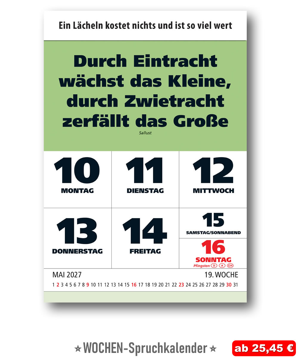 Dieser schöne Wandkalender wird aus hochwertigem, feinem weißen Papier gefertigt, und prägt seine Umgebung durch seine eindrucksvolle Erscheinung und durch handverlesene Leitsprüche, Bonmots, Zitate und Aphorismen.