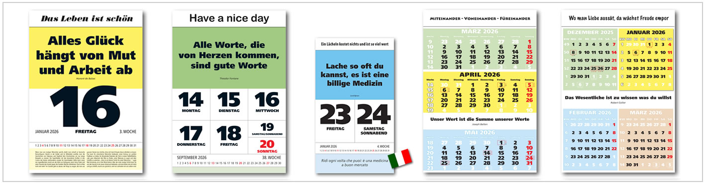 *NEU! Der Impuls-ZWEI-Tagesspruch-Kalender (doppio) 2026 in der Größe 21 x 34 cm: Jeder Sonntag ist Motivationstag mit eigenem Blatt und erfrischendem Kommentar zum Spruch. NEU: Von Montag bis Samstag enthält dieser schöne Zitate-Kalender neben der englischen Spruchversion (auf der Rückseite) ab sofort auch die italienische Spruchversion auf der Vorderseite - Für ein bisschen mehr Dolce Vita im Leben. ISBN 978-3-9825326-8-4Artikelbeschreibung: Ein ZWEI-(2)Tagesspruch-Kalender (doppio) mit goldrichtigen IMPULSEN! Die Vorteile des Impuls-Zwei-(2)Tagesspruch-Kalenders (doppio) werden Sie überzeugen:Preisgünstig durch Preisvorteils-Rabattstaffeln. Sonderpreise schon ab 100 Stk. Hier Individual-Angebot anfordern >>Standard-Kopfleiste gratis - wählen Sie aus über 20 Standard-Kopfleisten aus Info >>Alternativ: eigene Motto-Kopfleiste (sehr beliebt bei Privatbestellern) gratis Info >>Das ideale preisgünstige Firmenwerbegeschenk, jetzt sogar mit Firmen-Werbeleiste gratis Info >>Portofrei schon ab geringen StückzahlenÜbersichtliches 3-Länder-Kalendarium für Deutschland, Österreich und die SchweizDie Mondphasen der gesamten Woche werden auf der Rückseite angezeigtBeachten Sie das günstige Rundum-Sorglos-Paket Info >>ab 50 Stk.: Erweitertes Rundum-Sorglos-Paket durch Direkt-Werbekalender-Funktion Info >>NEU: Jetzt mit der englischen und italienischen Spruchversion. Holen Sie sich ein bisschen Dolce Vita nach Hause, denn von Montag bis Samstag enthält der Spruchkalender neben der englischen Spruchversion auf der Rückseite nun auch noch die italienische Spruchversion auf der Vorderseite! Genießen Sie Ihren Kalender also am besten bei einer guten Tasse Cappuccino.Dieser Zwei-Tagesspruch-Kalender (doppio) im Format 21 x 34 cm ist etwas kleiner als der Tagesspruch-Kalender (27,5 x 39,5 cm). Bitte beachten Sie außerdem, dass dieser Wandkalender KEIN reiner Tagesspruchkalender ist: Nur der Sonntag hat ein eigenes Spruchblatt mit Kommentar. Von Montag bis Samstag werden jeweils 2 Tage pro Blatt mit einem Zitat bereichert. Dieser Spruchkalender enthält insgesamt über 200 auserlesene Leitsprüche. Sie erhalten den Kalender in einer attraktiven farbigen Dekorschachtel mit aufgedrucktem Spruchbaum. Diese Schachtel ist eine beliebte Aufbewahrungsbox für gesammelte Lieblingszitate. Alle Sprüche werden auf der Blattrückseite in die englische Sprache übersetzt. Dort finden Sie außerdem Kurzdaten über den Spruchautor, den aktuellen Namenstag und die Mondphasen der jeweiligen Woche. Mit einer kostenlosen Standard-Kopfleiste (abgebildet zum Beispiel ist die Nr. 50) wird der Impulskalender zu Ihrem persönlichen "Don't worry - be happy"-Kalender. Statt mit einem Standard-Kopfleistenspruch können Sie diesen Abreißkalender auf 21 x 3 cm mit Ihrem einprägsamen Firmen-Werbeeindruck oder Ihrem eigenen Motto kostenlos individuell bedrucken lassen. Sie erhalten somit das perfekte Werbegeschenk für Ihre Kunden. Bitte beachten Sie hierzu die Informationen unter Werbe-Eindruck/eigenes Motto >>Geliefert wird der knapp 1,4 kg schwere ZWEI-Tagesspruch-Kalender in einer sehr schönen und geschmackvollen Dekorschachtel, auf der sorgfältig ausgewählte Zitate in Form eines Spruchbaums abgedruckt sind. Diese Dekorschachtel ist auch eine sehr beliebte Box zum Sammeln der Leitsprüche. Der Kalender hat einen Haken zum Aufhängen und ist als Wandkalender gedacht. Zum Aufstellen auf einen Tisch bieten wir alternativ einen preiswerten und robusten Alu-Kalenderaufsteller an. Kalender im Abonnement mit 3% Rabatt gewünscht? Bitte hier klicken>>Neu und exklusiv: Der Spruchkommentar fürs Ohr! Ausgewählte Kalenderkommentare können Sie ab sofort auch anhören. Sie erkennen diese Audiokommentare am Podcast-Logo rechts neben dem Kommentar. Hier reinhören >>Informationen zu den STANDARD-Kopfleisten (bitte anklicken)Informationen zu den INDIVIDUAL-Kopfleisten (bitte anklicken)