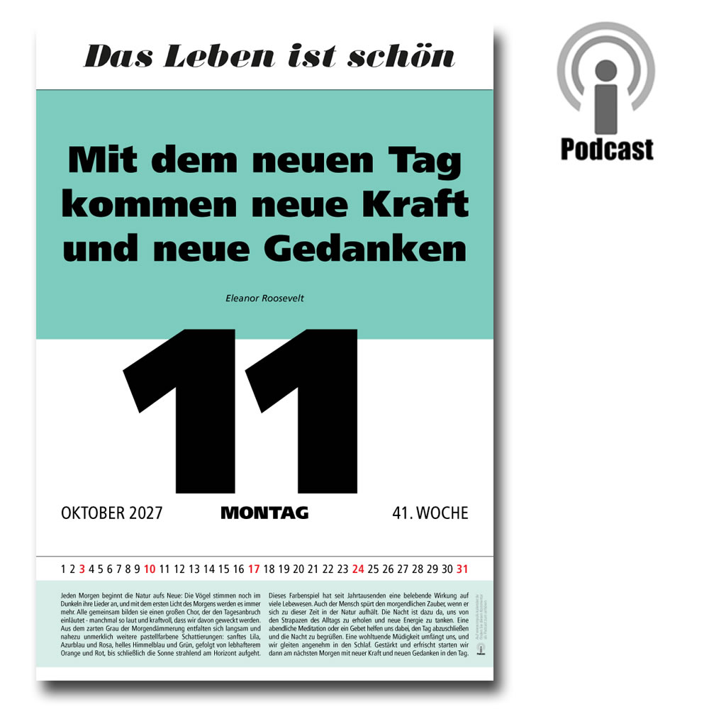 IMPULS-Tagesspruch-Kalender 2027: Hören Sie hier den Kommentar zum Tagesspruch vom 11.10.27 - Ein Zitat von Eleanor Roosevelt. Diesen und weitere 320 lesens- und hörenswerte Kommentare enthält der neue IMPULS-Tagesspruch-Kalender! Wenn Ihnen gefällt, was Sie hören, dann bestellen Sie am besten gleich Ihren neuen Spruchkalender durch Klick auf den nachfolgenden Link.