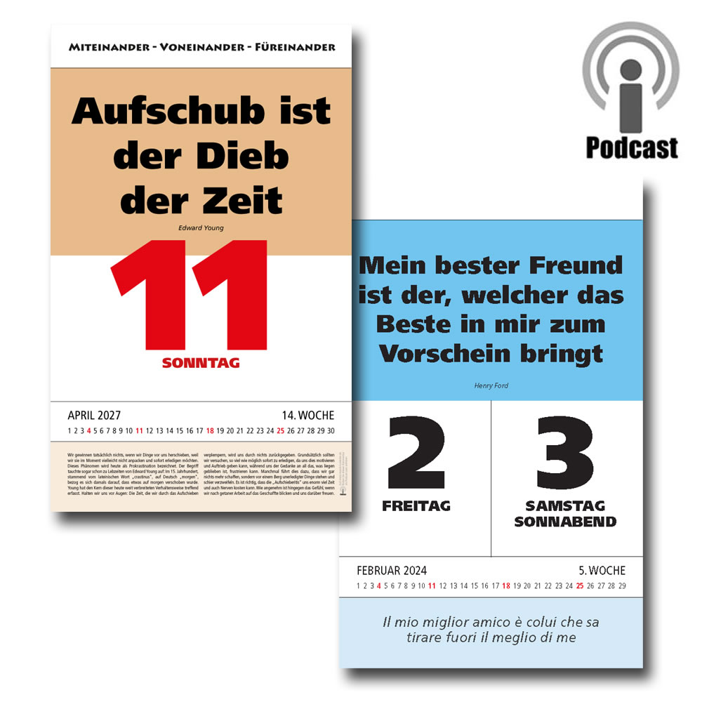 Druck auf nachhaltigem PEFC-PapierKalender im Abonnement mit 3% Rabatt gewünscht? Bitte hier klicken>>Jetzt bei IMPULS-Kalender GmbH: Der Spruchkommentar fürs Ohr! Ausgewählte Kalenderkommentare können Sie ab sofort auch anhören. Sie erkennen diese Audiokommentare am Podcast-Logo rechts neben dem Kommentar (nur bei Tagesspruch- und 2-Tagesspruch-Kalender). Hier reinhören >> Informationen zu den STANDARD-Kopfleisten (bitte anklicken) Informationen zur INDIVIDUELLEN Kopfleiste (bitte anklicken)